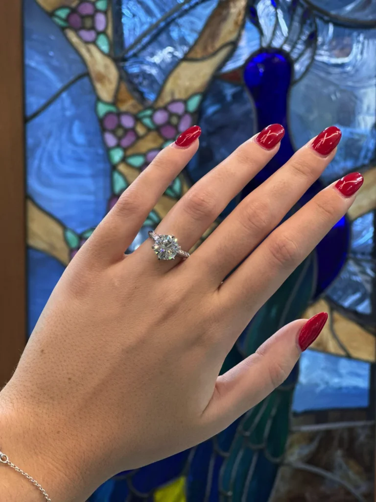 Un esempio? Brillante centrale di 4 carati, contornato di piccoli diamanti per circa 0,80 carati, su oro 18 carati da 5 grammi. Puoi scoprirlo sul nostro profilo Instagram e sullo shop online, insieme a tutte le altre creazioni.