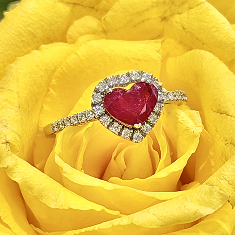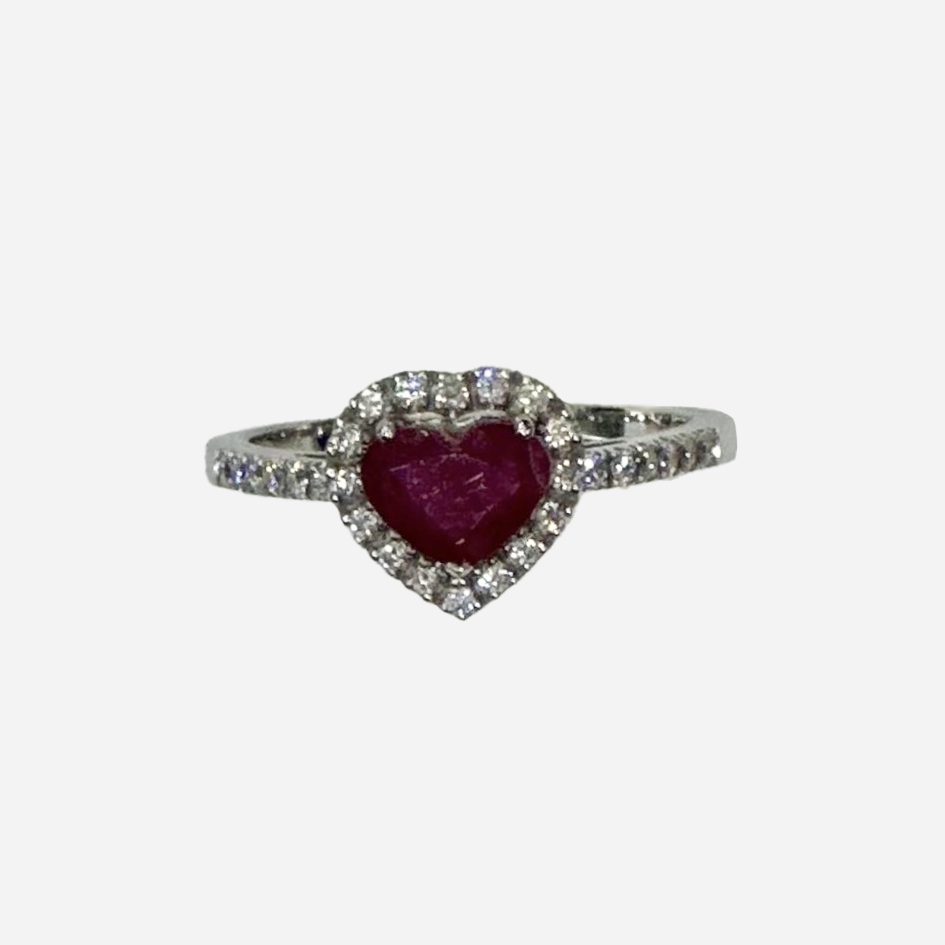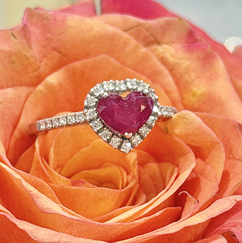 Anello con rubino a cuore in oro, impreziosito da brillanti. Una creazione artigianale dal design romantico e passionale, perfetta per celebrare momenti indimenticabili.