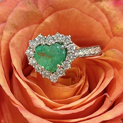 Anello in oro con un elegante smeraldo centrale, incorniciato da brillanti. Una creazione artigianale dallo stile raffinato e luminoso, perfetta per le occasioni più speciali.