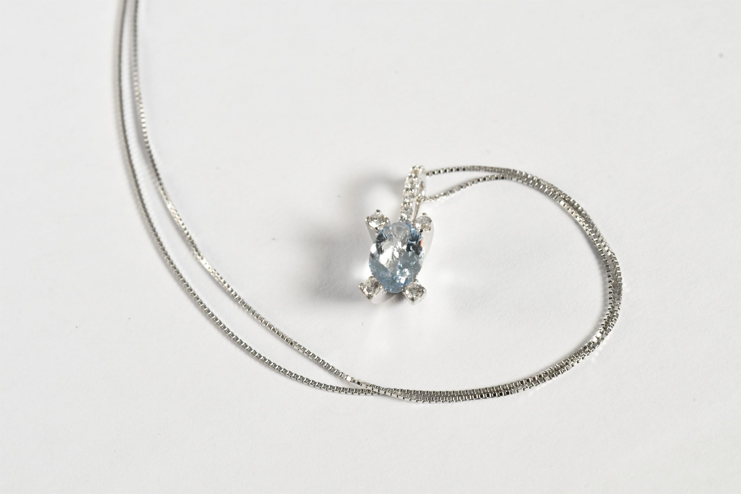 Collana in oro bianco 18 carati gr.1.66 con pendente in oro bianco ,acqua marina ovale carati 0.60 e diamanti taglio brillante carati totali 0.14 colore H purezza vs